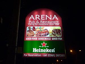 サヌールのバイパス沿いにあるドラフト・ビールが楽しめるスポーツ・バー。ヨーロッパの各国料理が揃っていて、特にポークリブやステーキなどのボリュームある料理がたくさん。店内は広々として大きなスクリーンが設置され、サッカーなどのスポーツ観戦をしながらビール片手にワイワイ賑やかなお客さんでいっぱいです。改装して前面に大きな窓が設置されたので、以前に比べると入りやすい雰囲気になりました。ビリヤード台もあります。