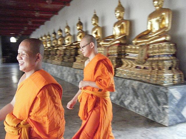 お釈迦さまの足の裏から背中側へ回ると、長く伸びた廊下にずらりと並べられた108つの鉢があります。希望者は脇にあるデスクでアルミの入れ物に入ったサタン硬貨を購入(20バーツ)し、それを順々に鉢の中に喜捨していきます。サタン硬貨はここでは煩悩の象徴であり、硬貨が鉢に入れられた時に響き渡る音は、煩悩が消えていく音が聞こえるようです。サタンはバーツ以下のお金の単位で日本でいう円以下の○銭にあたる硬貨です。