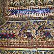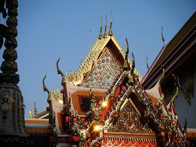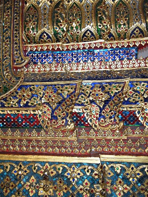 本堂の周りには、現チャクリー王朝のラマ1世から4世までの歴代王を象徴する4基の大きな仏塔が据えられています。中国からやってきた陶器の破片をはめ込んで造られた色とりどりの仏塔は、微妙に色分けがされていて、緑が1世、白が2世、黄色が3世、青が4世を表しています。この繊細な色彩感覚はさすがタイ人。中にはそれぞれの王の遺骨が納められていて、お墓のような役割を果たしています。大仏塔の周りには小仏像が並んでいて、こちらは寄付をすれば一般人でも遺骨を納めることができるのだとか。
