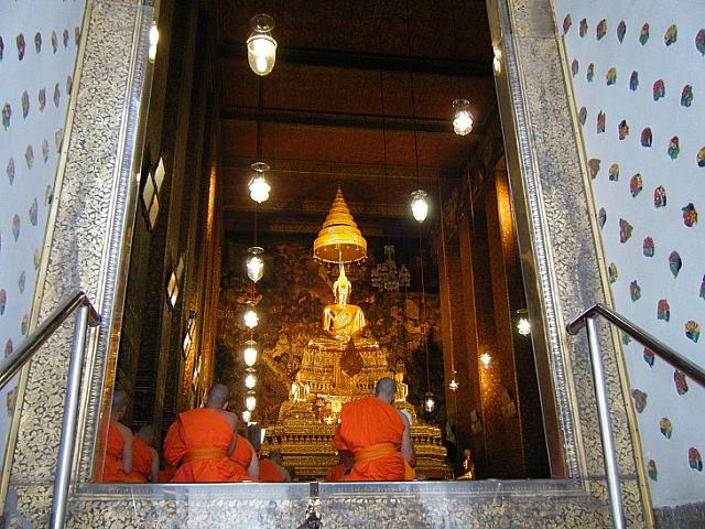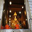 ワットポーの大事な見所は“寝釈迦仏”だけではありません。「本堂」も大事な見どころの一つです。ラマ1世によって建立された本堂は、外回廊と内回廊によって二重に取り囲まれています。中には、トンブリーから移されたというブロンズ製の本尊をはじめとして、150体の仏像が安置されています。この台座にはラマ1世の御骨が納められているといいます。それを知っているのと知らないのとでは、台座を見る目も下げる頭の角度も大きく違ってきますね。