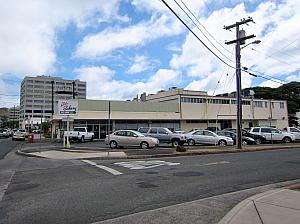 3) 1つめの信号があるノース・クアキニ・ストリート N. Kuakini St との交差点(「ロングス・ドラッグス」がある角)を左折したすぐ先の左手に看板とパーキングの入口あり。地図