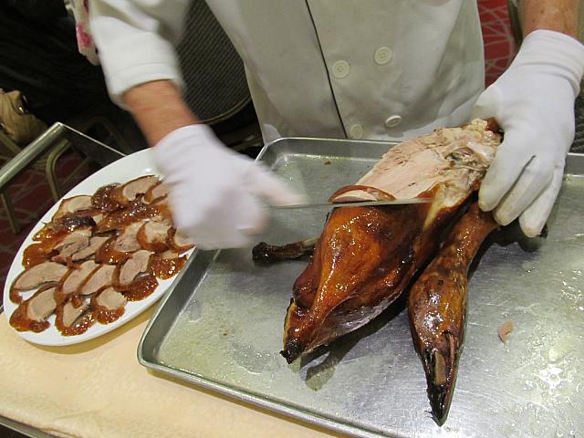 1979年から北京ダック一筋、30年近い経験を持つ北京ダック専門の楊道祥シェフ。テーブル脇で、手際よく北京ダックを切っていきます。多くの日本人観光客が彼と一緒に写真を撮って帰るそうですよ。お店で一番の有名人です。