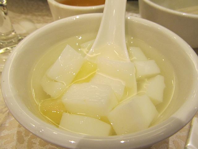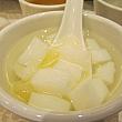 こちらは清朝時代の贅を尽くした宴会、『満漢全席』のメニューのひとつで、豚肉の脂肪と順徳の地鶏を中華ハムなどで巻き、さらに弱火で揚げたものです。春巻きのようにパリパリとした食感、鶏肉のうまみが十二分に引き出された贅沢な味わい。お皿の中央は、水牛の牛乳と卵白を、油を使わずに炒めたものが盛り付けられています。カニ身、オリーブ、中華ハムをと一緒にいただきます。濃厚な地鶏の味とさっぱりとした卵白の味、一皿で二つの異なった味を楽しるのはうれしいですね。