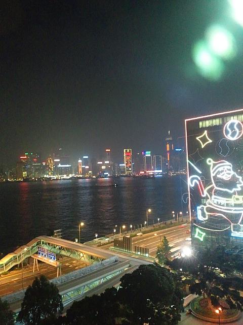 こちらも同じくハーバービューですが、部屋の位置が少し角になり、先程の客室とは眺めの角度が違います。香港島が正面に一望というわけには行きませんが、ここからは香港島中心部もばっちり臨めます。今や香港の顔、湾仔のコンベンションセンターも見えます。夜景は、こちらの客室のほうがきれいかもしれません。