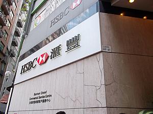香港上海銀行略称、英語でHSBC、中国語で滙豐銀行。イギリスの金融グループHSBCホールディングス傘下の銀行で、 香港に本店を置き、チャーターバンク、中國銀行と合わせて香港ドル発券銀行の1つです。残念ながら日本には支店がありませんが、時価総額規模では、アメリカのシティグループ、バンク・オブ・アメリカに次ぎ世界第3位(ヨーロッパでは第1 位)に君臨しております。こちらの支店、ATM機が店舗外に一台しかないために、ピークタイムは列ができています。