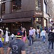 ピザを焼く大きな釜が目を引く1階、街を行き交う人々を見下ろせる2階、どちらも周囲の壁はトルコで焼かれた青いタイルが飾られています。舟形をしたトルコ風ピザ「ピデ」は10種類以上、ベジタリアンのためのものも用意されています。本場のピザよりちょっと厚めの生地は、それでもとてもサクサクとクリスピー、何枚でも食べられそうです。