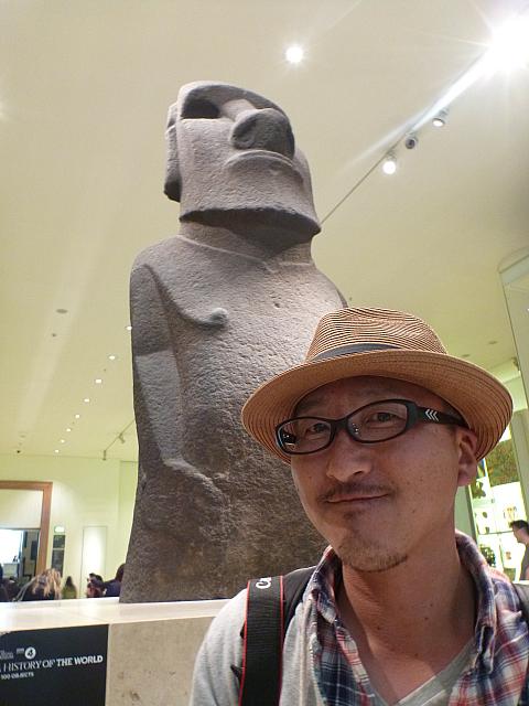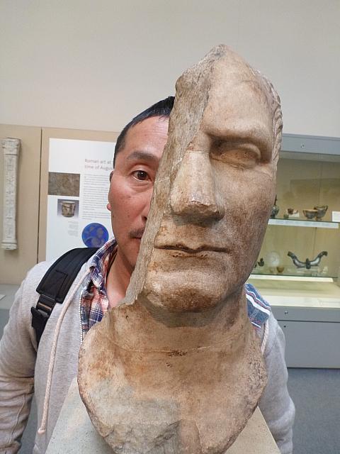 一度グレート・コートに戻りましょう。ギリシャ彫刻の部屋とロゼッタストーンの間(右側)にあるのはメソポタミアのもの。人間の顔をしたこの動物はアッシリア、紀元前7世紀に西アジアを支配した国のマッソスと呼ばれる像です。館内で一番大きな展示物なので、見つけられない心配はないと思いますが…ヒゲのはえた人の顔と翼を持つ牡牛、人頭牡牛は悪霊を払う力があると言われ、王宮の入口や城門に飾られた守護像です。前から見ると2本の前足が横からだと3本。歩く姿を表現するための苦肉の策、でしょうか?アッシリアの狛犬、もしくは仁王像、なんて考えると親しみが沸いてきませんか?