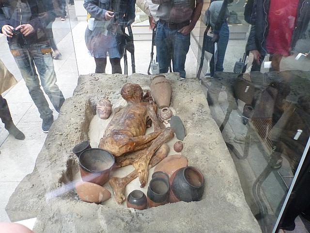 今、抜けて来たミイラが並ぶ部屋に戻りましょう。なぜか日本人に人気と言われているミイラの展示室。3つの部屋いっぱいにミイラに関する展示がされています。ここで一番有名な?ミイラは、髪の毛が赤いことから名付けられた「ジンジャー」。右側の部屋にあります。これは本来の包帯を巻いて作られたミイラとは違って、埋められた場所で自然にミイラ化してしまったものです。
