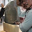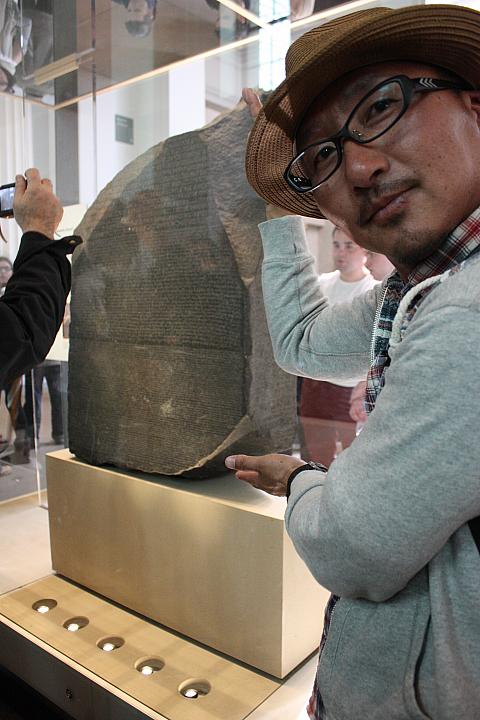 まず、館内の平面図は必ずスタート前にピックアップしておきましょう。メーンエントランスからグレート・コートの左側へ、その中央を入ってすぐの部屋。いつも人だかりができています。ガラスケースの中の黒い石、これがエジプト考古学史上最大の発見と言われているロゼッタストーンです。1799年、ナポレオンのエジプト遠征時、ロゼッタというナイル川河口の街で発見されました。