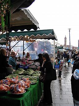 このマーケットには、ロンドンの一般スーパーよりも3〜5割は安い生鮮品が目白押し。また、花屋やハーブ、イタリア直送のチーズを扱う露店もあって、ロンドン市民がどんなものを食べているのか、かいま見ることができます。市場の端に立つ時計塔の下には、ドイツ直輸入のソーセージを焼いている屋台が!市場巡りのついでにぜひお試しを。