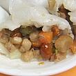 飲茶のメニューを見ていきますが、覚えておきたいのは日本人に人気の小龍包がないことです。つまり地元の人には人気がないという事ですね。逆を言えばそれだけローカルの味を楽しめるということです。「鮮蝦腸粉」(3個入り=大=23パタカ)は、腸粉ですのでライスペーパーを使います。具材は小エビだけというシンプルなもので、甘口のしょう油で食べます。見た目より結構大きいのでシェアした方がいいと思います。「潮洲粉菓」(3個入り=花=15パタカ)は、具だくさんの飲茶で、写真を見てもわかるように、ナッツ、ニンジン、長ネギ、タマネギなどが入っています。これは日本人にはあまり馴染みがありませんがマカオ市民、香港市民には定番の1つです。「咖喱中肉酥」(3個入り=花=15パタカ)は、カレーや長ネギが入った、カレーパンならぬ“カレーパイ”という感じのもの。これは間違いなく日本人の口に合う事でしょう。