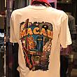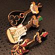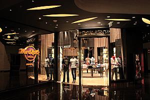 店に入ると、ギターをモチーフにした商品がたくさん目に入ります。壁にギターの絵があるのですが、よくみるとピンバッチを大量に使って描いています。ピンバッチには”Hard Rock Macau”の文字があり、デザインは約30種類。値段は100パタカ前後です。ここにある、マカオ限定商品は約20種類で、Tシャツ、帽子、ストラップ、キーホルダー、カップ、ぬいぐるみ、ドラムスティックなど。ぬいぐるみは手にタトゥーがあって、レザーのジャケットを着ていて、とってもクールです。