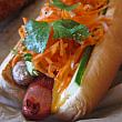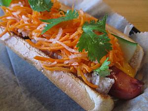 周辺の建物に埋もれてしまいそうな小さな店ながらもホットドッグ人気店。看板メニューはアジア各国料理からヒントを得たトッピングがのったホットドッグ。メニューのネーミングもユニークでメニュー名だけでは味の想像不可能。人気メニューはオーナーの名前を取ったメル&スティーブ、中華風のワンディン、ベトナム風のビン。オーダー方法はトッピング、ソーセージを選択しパンを選ぶ。日本のとんかつ、カレーが変身したメニューもある。女性でも2つはいけるのでコーンドッグもお試しあれ。イートインスペースは約8席。