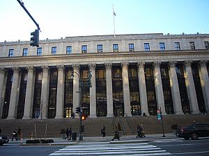 マンハッタンのミッドタウンにある、ニューヨークで一番大きな24時間営業の郵便局です。コリント式の巨大な柱が並ぶ外観は圧倒的で、記念撮影にもおすすめです。エントランスから道路にかけては、広々とした階段が広がっていて、天気のいい日には、そこでランチやひと休みするニューヨーカーの姿もみかけます。また近くには、ペンシルベニア駅やマディソン・スクエア・ガーデンなどのスポットもあります。