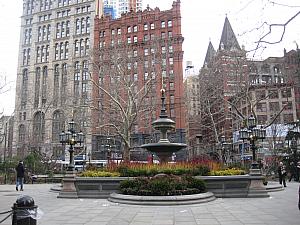シティホールの周り一面に広がる公園で、公園の中央にある噴水とレトロな雰囲気のガス灯が歴史を感じさせます。いつも忙しいロウアー・マンハッタンの中で、いわば人々の憩いの場となっています。シティ・ホールの建物はもちろん、ウールワース・ビルも目の前にあるので、ロウアー・マンハッタンの歴史的建築物めぐりのひと休みにぴったりのスポットです。