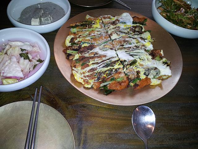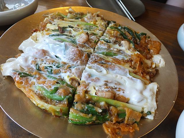 また、お店の歴史をお店の方にうかがってみると、お店は1920年ごろ東莱市場の中で始まったと言われていて、当時、市場内で働く商人や買い物客の昼食として親しまれた料理だったんだそう。市場内で好評だったパジョンのウワサが広まり、このパジョンを食べるためにわざわざ市場まで足を運ぶ人も少なくなかったんだとか。その人気から、郷土料理の釜山代表として李氏王朝時代の宮廷に献上され、名実共に釜山の名物になっていったのがこちらのパジョンなんです。一般的に言われているパジョンとはちょっと違い、中がトロッとしているのが特徴で、パジョンの定番食材「イカ」が入っていないところも一般的なパジョンとの差異として知られています。