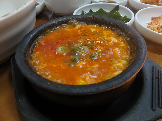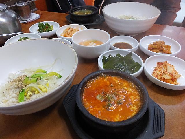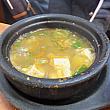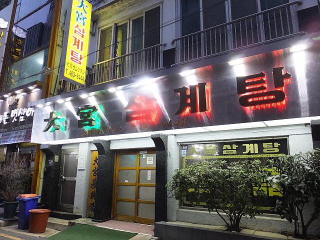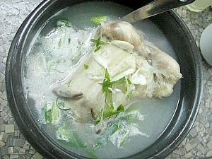 中央洞の釜山郵便局の裏手にある、界隈のビジネスマンが昼どきに押し寄せるサムゲタンの絶品のお店。店の近くには店名が書かれた大きな看板が。店内は広く、中央にテーブル席、両サイドにオンドル部屋が。主なメニューはもちろんサムゲタン。土鍋の中に若鳥が1羽まるまる入っています。中にはなつめ・高麗にんじん・もち米が。これを小皿に取り塩を付けていただきます。スープは少し白濁で、もち米にまでしっかり染み込んでます。若鶏の身も柔らかく臭みなし。もち米との相性もバッチリ。またサムゲタンには朝鮮人参の体に良さそうな香りの人参酒がつきます。またにんにく、ごまなどを入れフライパンで焼いた焼塩も美味。