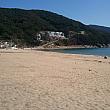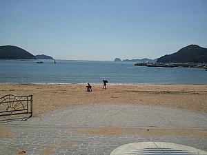 埠頭の内側に円を描くように丸いラインで入り江になっている海辺に白い砂浜が幅広くステキに広がっている海水浴場。海水浴場の近くには彫刻造形物、コンビニ、飲食店、トイレなど必要な観光施設を備えています。