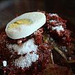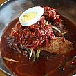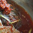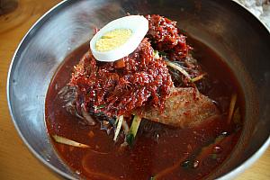 個人で行くにはちょっと難しい場所にあるのが地元の名店。ちょっと行きづらいところにあるビビンミョンとスユッの名店。金海空港からタクシーで約5分ほど金海方面へ行くと、静かな川岸にひっそりと立っているのがこちら。何も周りにはないお店ですが、お店の駐車場や店内はたくさんのお客さんで賑わっているんです。こちらの人気メニューのビビンミョンは、魚を甘辛く煮たものが乗っていて、お酢と砂糖をかけていただきます。