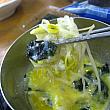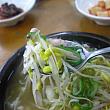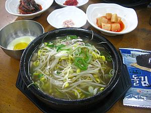 コンナムルクッパ(豆もやしスープご飯)の本場、全羅北道全州でも美味しいコンナムルクッパ専門店として有名なお店。メニューはコンナムルクッパと1杯から販売しているモジュ(母酒、薬草入りのマッコリ)だけ。あっさりしているけれどいろんなダシの味のきいたスープにたっぷりの新鮮なシャキシャキ豆もやし、ご飯、それから刻みキムチが入っています。一緒に出てくる半熟卵にはスープをスプーン2、3杯ほどと刻み海苔を混ぜてから豆もやしにつけて食べるもよし、スープの中に入れてしまうも良し。食後にはレジ前に置かれている大釜の「ティパッ」(麦パットライス?)を一握りいただくと、口の中の辛さが緩和されるとか。