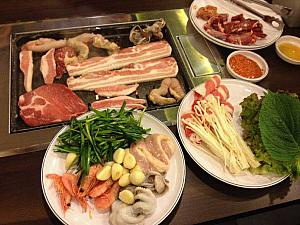 なんとランチは9,900ウォン、ディナーは10,900ウォンで焼肉とサラダが食べ放題。カフェ風のカジュアルなテーブル席でいただける約40種類もの料理。やっぱりメインは焼肉。定番サムギョッサル、コチュジャンサムギョッサル、モクサル、デジカルビ、ソーセージに始まり、牛カルビ、ハンジョンサル、牛コプチャン、トッカルビ、チャドルバギ、トシサルと呼ばれる貴重な部位まで。さらには海老やチュクミ(イイダコ)などのシーフードも!その他、付け合せの野菜やキムチはもちろん、揚げ物にサラダバーにフルーツ、ごはん、スープすべてお代わり自由。時間制限がないので自分のペースで食事ができるのがうれしい。