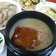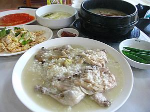 忠清北道(チュンチョンプット)で道庁所在地である清州(チョンジュ)市に続く道内第2の都市、忠州(チュンジュ)市の食堂。市街地からは少し離れた場所にあります。こちらの人気メニューは丸ごとの鶏にご飯と漢方を詰めて煮込んだものと、それと一緒に煮たヌルンジ(おこげ)がセットになった「ヌルンジ参鶏湯」。柔らかい鶏肉と自然な鶏のダシにかすかな漢方の香り、香ばしいおこげが相まって素朴だけれどやさしいお味。すごいボリュームなので3、4人でいただいてもお腹いっぱいになりそう。鶏の代わりにオリ(鴨/アヒル)を使ったものもあり。
