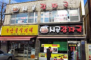 豚の骨付き肉とじゃが芋が絶妙にマッチしたピリ辛のお鍋、カムジャタンのお店。カムジャタンのおいしい店が集まる名物通り「鷹岩洞(ウンアムドン)カムジャグッ通り」にあります。