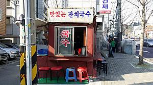 地下鉄6号線ヒョチャンコンウォンアッ(孝昌公園前)駅4番出口を出るとすぐ!地元の人々に愛されるチャンチククスの専門店。狭い角地に建つ店は4人も入ると満席に。非常に狭いキッチンで、無駄な動きなく麺を提供するおばちゃんに注目。山盛りのそうめんに優しい煮干しスープをかけ、卵焼きときゅうりをトッピングしたチャンチククスはさらっと食べられる。二倍量でも値段が同じというのもうれしい。