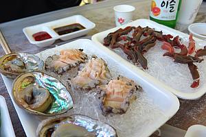 九老区の九老高大病院サゴリ(交差点)近くにあるとってもリーズナブルな刺身専門店。主にテイクアウトで販売しているけれど、店内のテーブルでいただくこともできるというスタイルのお店です。店内で食べるには、まずレジで注文と会計をして、醤油やわさび、刺身を包んで食べる葉野菜などはセルフでテーブルに持って行きます。席代などいわゆるヤンニョム代はナシ。お酒や飲み物は持ち込み可で、多くのお客さんはお店を出て左へ数メートル行ったところにあるコンビニで調達してきます。焼酎の販売はあり。そんな自由なスタイルのお店ですが、トイレは店内に男女別であります。店内は広く、テーブルもたくさんあり、夕方からは地元の人でいっぱいになります。