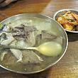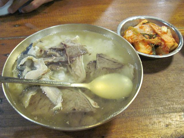 「スユッ」と呼ばれる茹でた肉のメニューがありますが、それを除くとお店のメニューは「コムタン」のみ!「コムタン」には牛肉のみが入ったものとヤンと呼ばれる牛の胃袋のみが入ったものの2つがあって、注文の際に好きな方を伝えます。牛肉バージョンなら「コギ」、ヤンの方なら「ヤン」または「ネジャン」と言えばOK!でも一番人気なのは「特(トゥッ)コムタン」。これは「特」が付くからと言ってBIGサイズになったものではなく、牛肉とヤンが両方入ったもの。二つの味を楽しめるうえに具がたっぷりなので、サイズアップしたも同然!金属の器に入れられ、写真のような形で出てきます。(ご飯ははじめからスープに入った状態で運ばれます。)