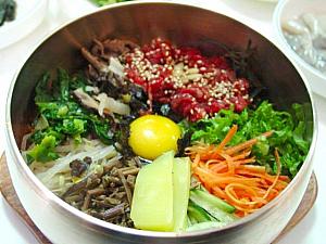 「中央会館」に行くつもりが、ドアを開けてみるとおばさん1人新聞を読みながら暗闇の中ご飯を食べてらっしゃる。う~ん、なんか入りづらいので、その隣りの同じく創業40年のビビンパッ専門店「ソンミダン」に入ってユッケビビンパッを食べてみることに。後で調べてみると、ここもビビンパッでかなりの有名店。まず、おかずが10皿、ビビンパッの器は石鍋ではなく真鍮製で上品に出てきます。ここの特徴はご飯が最初から味付けされてでてくること。まんべんなく味付けされたご飯が底に行くほど余熱で香ばしい。シッケ(シナモン風味のジュース)のデザートもあり。