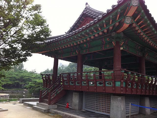 入口を入って最初に見える大きな広場。左手には泉雨閣(チョンウカッ)と青鶴池(チョンハッチ)という池があり、その前にはイベント用のステージが設けられています。入口を直進するとタイムカプセル広場、そして泉雨閣を左に見ながら奥に進んでいくと、「南山コル韓屋村」の見どころでもある韓屋村(ハノッマウル)が5棟並んでいます。それでは中へご案内しましょう!