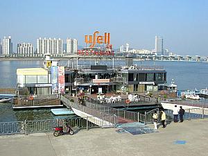 蚕室漢江公園内にある遊覧船の船着場。チンジュナルとヌエナルの、2つの船着場があります。1階には、Angel-in-us Coffee(カフェ)、中華料理、コンビニがあり、2階にはカフェとレストランがあります。遊覧船のコースは蚕室からトゥクソム、漢南大橋(ハンナムテギョ)を回って戻ってくる周航コースと蚕室から汝矣島へ行く片道コースなどがあります。