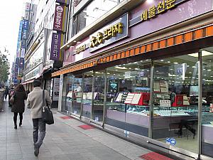 鍾路(チョンノ)は昔から金の精工で有名な所。たぶん、鍾路に高級仕官が多く住んでいたため、自然と金銀の精工技術が発達したんでしょうね。今も鍾路の礼智洞(イェジドン)には大きいな貴金属の店がたくさん立ち並んでいます。ほとんどの店は工房を持っているので、その場で希望通りのものを作ってくれます。また同じ種類の店が並んでいるのでゆっくりいろいろ見てまわって、値段を比べながら買えるのもここだけの長所。長く使っても飽きない高価なモダンデザインのものから、ちょっとしたアクセサリー感覚の18kのファッションリングまで、いろいろあります。お財布の中身がちょ~っとさみしい学生さんには14k,18kのものを売っている鍾路2街(チョンノイガ)の方がオススメ。仁寺洞(インサドン)の入口にある「クンカンセファ(靴屋さん)」のすぐそばにある大きな商店街では個性を重視する若者だち向けの独特なデザインの貴金属がそろっています。アクセサリーはほしいけど、ニセモノがいやという人はもっと安い準宝石もいいかも。準宝石の場合、宝石の希少性と独特なデザイン、手頃な値段まで!わたしたちにピッタリです。