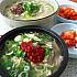日本のお汁粉のようなパッ(小豆)スープにカルグクスがイン!お汁粉の中に浮かぶ白玉の代わりに、カルグクスの麺が入っているというとよいのでしょうか?!このパッカルグクスは、もともと食道楽で有名な全羅南道地方の珍味とか。小豆は鉄分、ビタミンB1を多く含み疲労回復に良く、むくみを解消するので、とても体に良いそうですョ。ちなみに、普通、塩味も甘みも全くつけられていない状態で出され、塩や砂糖を加えながら好みに味に調整していただくそう。またパッチュッ(小豆のおかゆ)とともに、冬至にいただくメニューでもあります。
