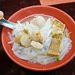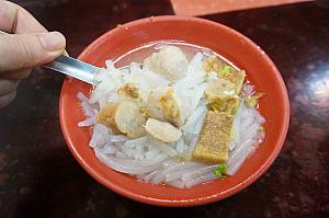 ナビは看板商品である「綜合米粉湯(45元)」を注文! トッピングは黑輪(練物)、貢丸(肉団子)、油豆腐(厚揚げ)です。米粉と見て、勝手に新竹のビーフンのような麺だと思っていましたが、米苔目のような太さのライフヌードルで透き通っていました。そういえばこういうものも米粉といいますよね……。すっかり忘れていました。つるんとした麺はスプーンですくって食べるのが台湾流。ナビはぷりぷりでおいしい貢丸と味が染みている油豆腐のおいしさにニンマリしましたよ~。薄味に見えますが、ダシの味がしっかり染み出ていて、少しモツっぽい味がするのがこちらの特色かなと思います。