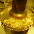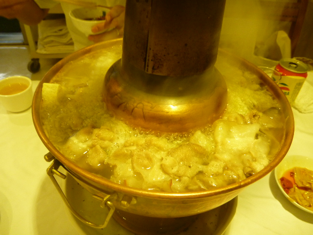 鍋の中央にアツアツに焼いた炭を入れ、エントツ状の蓋をします。炭が銅の鍋に熱を伝え熱くなります。スープが熱されると、その中にたっぷりの酸菜と、脂がたっぷりのった白肉(豚肉)を入れ、味を出します。あとは鍋のドーナツ状の部分にお好みの具を入れ、食べごろになるまで待つだけです。何を食べようかとあれこれ具を探していると、手が中央のエントツに触れて「アチチ」なんて事もあるので、気をつけてくださいね!ちなみにグツグツ煮込まれて来た時、この蓋を少し開けたら、火が弱まるんです。