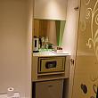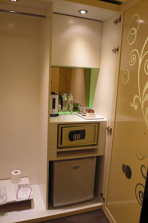 フロントの左にはラウンジがあって、外来の客が自由に入れるようになっていて、ちょっとした商談もできるような空間になっています。天井にはこちらのホテルのメインデザインが描かれていたり、ソファもモダンなものを使っていたり、とてもスタイリッシュでした。壁には液晶テレビがさりげなく置かれていたり、無料でインターネットにつなげるパソコンも用意してあり、機能的です。コーヒーメーカーも置いてあって、セルフですがフリーでコーヒーをいただけるようになっています。ノートパソコン持参なら無線LANでの接続も可能です。