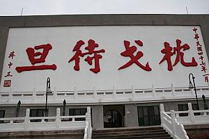 「枕戈待旦」の文字は、地下2階、地上5階の建物の上に書かれています。この意味は、「矛を枕にして寝て、あしたを待つ」すなわち戦いの準備をいつも怠っていないということ。1958年7月、蒋介石元総統が馬祖を訪れた際、馬祖の軍人と一般の人々が祖国復帰への志を忘れていないことに痛く感動し、この文字を書いたそうです。元の字を拡大したのが今のこの大きさで、現在ここは老酒などを販売するショップとレストランになっています。食事した方の話しによると、景色もいいし、海鮮メインの料理はなかなかおいしいそうです。さて、展望台に上ってみると福澳港の全景が眺められ、福州往復の船も見えます。眼下には蒋介石元総統の像があり、うしろを振り向くとこの文字が迫ってくるような錯覚に陥ります。本当に大きいです。緊迫した時代は過ぎて…建物前方の広場では、野生のヤギたちがのんびりと草をムシャムシャ食べていました。