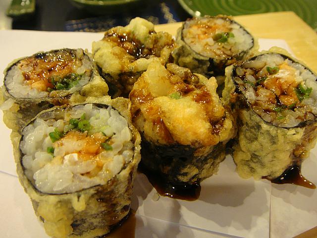 そしてこちらが、お店の名前が付けられたその名も「ザ・スシバーロール」。人気メニューだそうです。食べてみると…「オーマイゴーッ!これは一口サイズの海鮮アミューズメントパークや~!?」さすがは人気メニュー、見た目にもとってもキレイでおいしかったです(*^_^*)