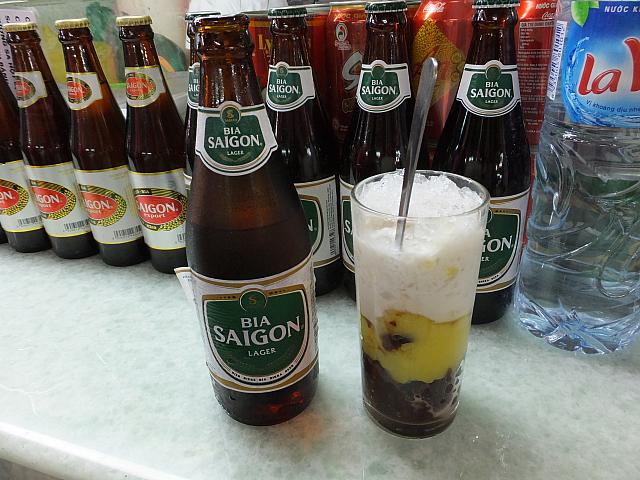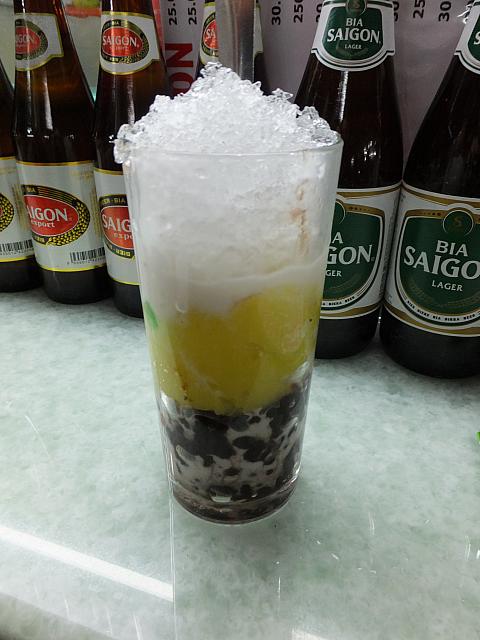 まずは、外の暑さで渇いた喉を潤そうと「CHE 」の看板、ありました。この屋台はジュース類もチェーもかなりの種類が並んでました。おばちゃんたちのけたたましいベトナム語に圧倒され、静かに指さしてオーダー。