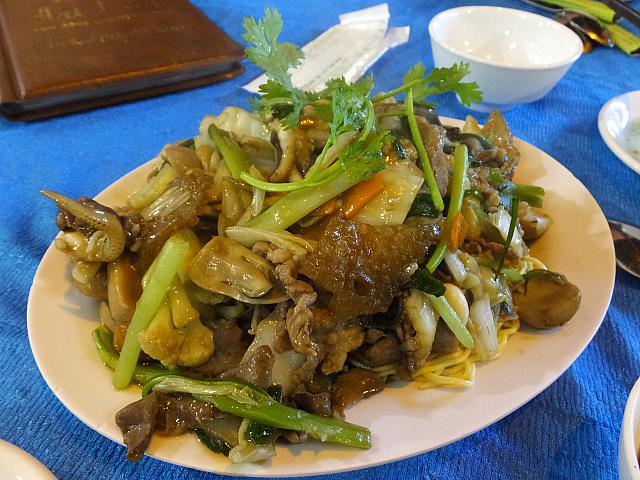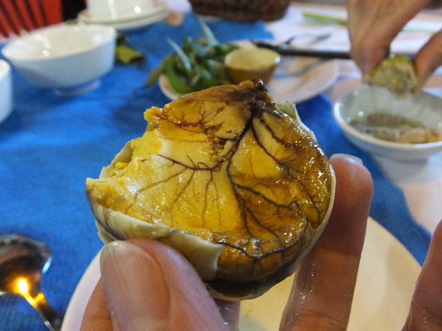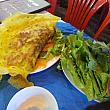 もうひとつは、XOI PHONG(Swelled Sticky Rice)。もち米の風船ボールでしたね。運ばれてきたときには隣りのテーブルの人たちが注目。さっそく箸で割ろうとしたらねばねばして割れず、指でさわるとアッツイ!アチアチなんで、ちょっと待ってからつっつくと、あらっ?何も入ってない?ええっ?なんと!もち米を膨らませただけの料理だったのです。ちぎろうとするとまだアツツ。箸で切って食べてみます。ちょっと甘味もあり、おモチ好きの人はぜひお試しください。きっと好きになるはず!