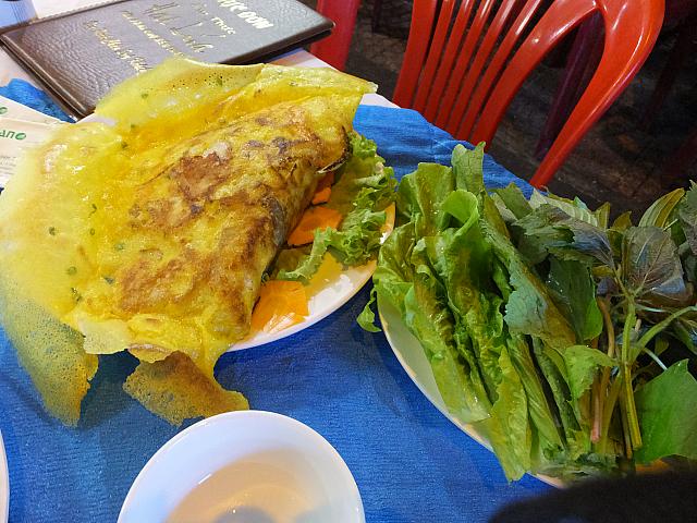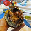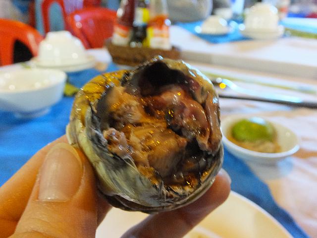 屋台のハシゴをしたいがために、最初に目がついた2種類だけに決めたナビ。ココナッツ漬けのエビはTOM SU HAP DUA(Prawn Steamed in Coconut Water)5万8千ドン。メニューにはエビが何個かで選ぶようになってます。ナビたちは一番少ない数を選ぶことに。屋台内は外国人、地元の人たちでほぼ満席。テーブルの片づけはピンクの布に骨やら食べカスを包み、白い布上に残されたものはササッと下に払い落すだけ。